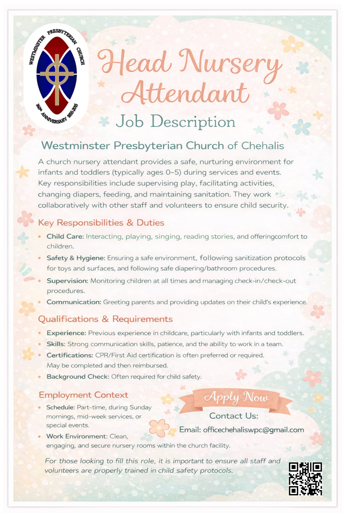 Traits Desired: The individual in this position should be passionately interested in working with Youth and possess a good understanding of Christian values, Presbyterian theology and Presbyterian practices. Also, the ability to work with all ages of youth and their families, communicate well, and a willingness to work within the systems of the church are very important qualities.